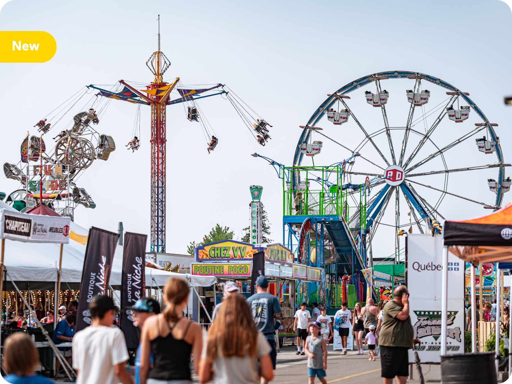The agricultural exhibition features animal prizes, sections on textile arts and horticulture, and an area dedicated to agricultural machinery. Families can enjoy the Beauce Carnaval rides, inflatable games, and wagon rides, along with two marquee performances under the big top.
